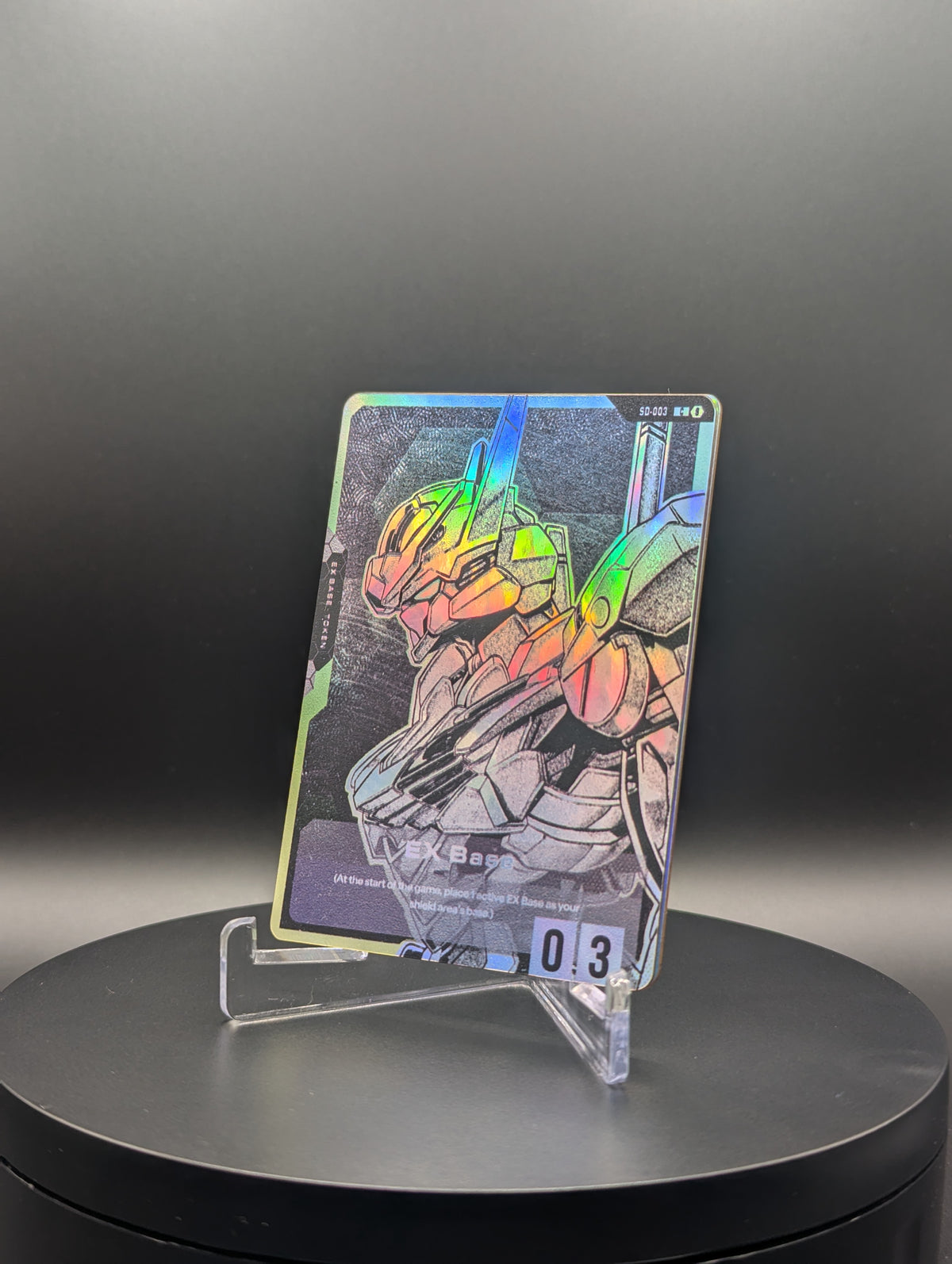 Featuring exclusive artwork inspired by the Gundam universe, this EX Base brings dynamic energy to your gameplay. This is designed to replace the standard and bland EX Base with insane foiling and design that celebrates Mobile Suit Gundam.